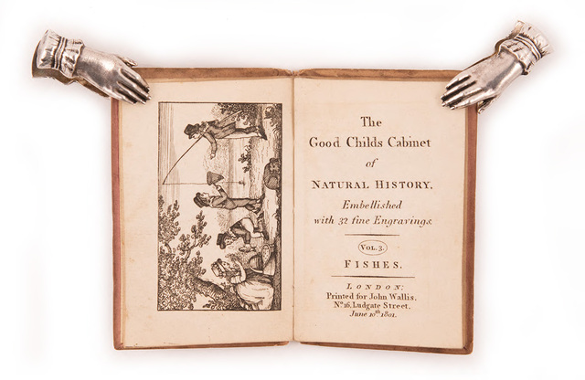 In this frontispiece interlocutor gesture, three boys and a girl capture and examine water animals from a pond. Their joyful activity suggests a parallel between the collection, examination, and cataloguing of fish inside of the book and the same activity that readers should perform in the world, as another way to “read” and label nature. The same dog appears in the Birds frontispiece, which suggests these images all feature the same fictional family. Although these miniature books are strict catalogues without any fictional characters or story elements, the frontispiece siblings connect the cabinet with conventions used in familiar science books, which typically do feature an exemplary wealthy family of four or five siblings who collect specimens and learn through conversation.