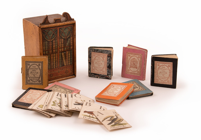 A miniature library published by Darton and Harvey containing a set of animal alphabet cards and 8 volumes: 1) The Cries of London, 2) The Infant’s Own Book, part I, 3) The Infant’s Own Book, part II, 4) A Lecture on the Alphabet, 5) People of All Nations, part I, 6) People of All Nations, part II, 7) The Picture Shop for Little Children, part I, and 8) The Picture Shop for Little Children, part II. Miniature libraries tie together reading with observation of common objects in several ways. The miniature books contained in the box typically combine a small image on one page opposite a descriptive sentence written in a chatty style, suggestive of a parent's voice addressing a child who is looking at the book. The book itself is a cabinet of little things, housed with other books inside a cabinet. The usual illustrations on the sliding lids typically accentuate this theme by featuring a piece of furniture for storing books on top and objects on bottom, and the inclusion of object alphabet cards draws attention to the materiality of children's texts, which were supposed to reference the world of things as closely as possible. Also called "doll's libraries," miniature libraries could be used by children to imitate the chatty voice of their parent or nurse while pretending to teach a doll, pet, or sibling. This imitative use adds a metacognitive dimension to the library.