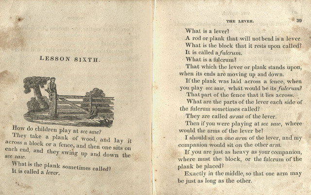 “Lesson Sixth” introduces the lever and fulcrum, a simple machine, through a dialog about the child’s experience playing with a seesaw, as shown in the illustration.