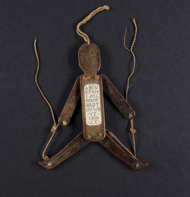 A smiling wooden jumping jack toy with strings, which a child can pull to make the jointed puppet dance. A simple ivory plaque attached to the torso displays the alphabet in capital letters, signed “1810 J. E.”
