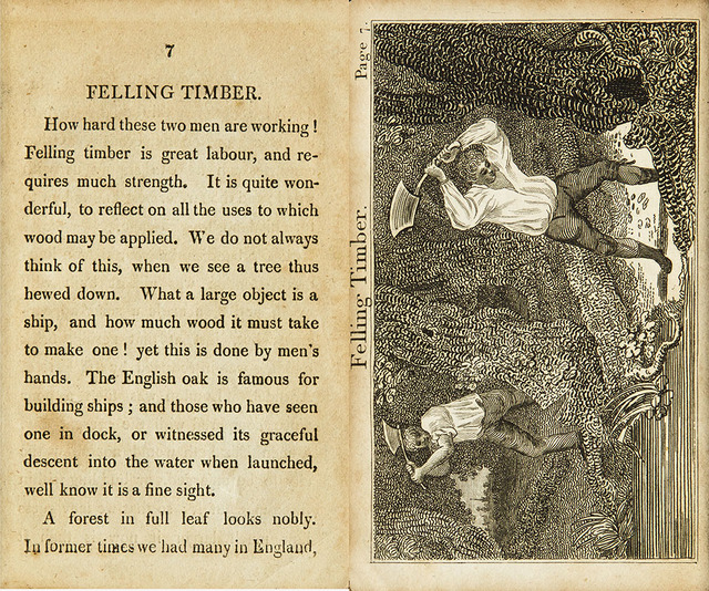 Spread for “Felling Timber” from Rural Employments by Mary Belson Elliot, published by William Darton, 1820, pages 7–8. Held at the Baldwin Library of Historical Children’s Literature, George A. Smathers Libraries, University of Florida, 15h4424.