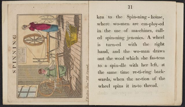 In the illustration on the left page, mother and daughter spin wool, each working at their own spinning wheel in an otherwise empty room, possibly the corner of their cottage. The description to the right uses words of one syllable for beginner readers to describe “the Spin-ning-house, where wo-men are em-ploy-ed in the use of ma-chines, call-ed spin-ning jen-nies,” and explains how women use this machine. The contrast between the earlier cottage industry depicted in the illustration with the newer factory technologies described the text is typical of many production stories about textiles for younger readers. The mother and child spinning in their cottage or outside the cottage door held sentimental value for readers, capturing the industry of virtuous poor families. This older process retains visual prominence in books on cloth even when the text celebrates new inventions that lowered the price these families could demand for their goods. Including the child and parent together symbolizes that older methods of spinning will be passed down regardless of new inventions, lending a comforting sense of generational stability amidst rapid industrial changes of the period. At a time of Luddite resistance and social unrest, reassurance predominates in younger production stories like this one, providing something like Richard Scarry's approach to a busy village at work. The hand-colored engraving is printed on a different kind of paper and appears smaller than surrounding pages. Some users removed pages like these or purchased them separately to hang on the wall as educational prints.
